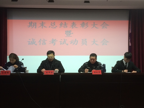 2016年1月13日下午16时,学生处于学院报告厅召开期末总结表彰暨诚信考试动员大会,出席本次大会的领导有学院副院长胡伟国、学生处处长谢枝彪、团委书记马雪榕,学生处一科老师及全体安防生参加会议,会议由学生代表董榕峰主持。