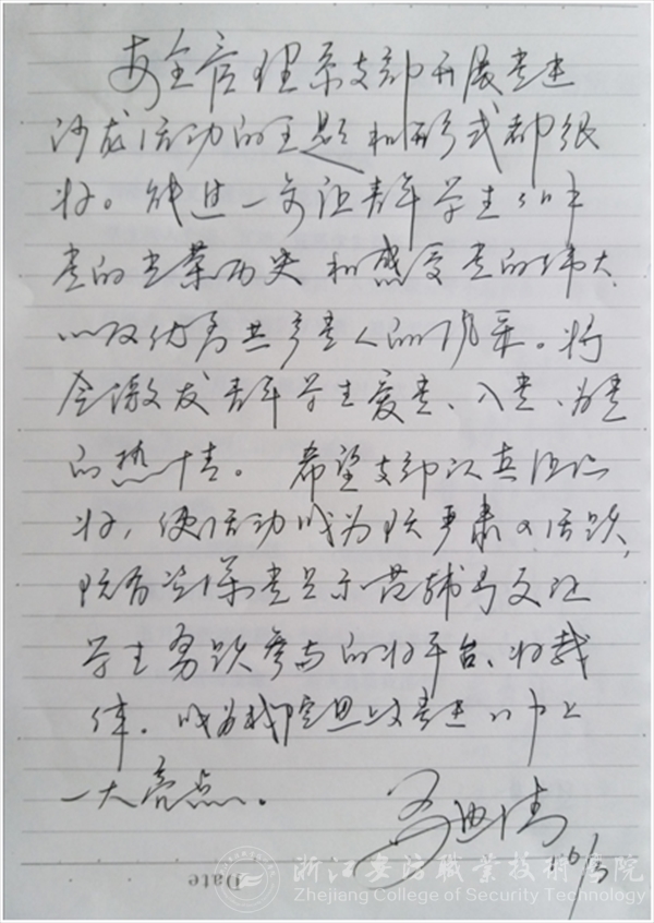 学院姜迪清书记还特意为本次“党建沙龙活动”做批示:“安全管理系支部开展党建沙龙活动的主题和形式都很好。能进一步让青年学生了解党的光荣史和感受党的伟大。学习优秀共产党员的风采。将会激发青年学生爱党、入党、为党的热情。希望支部认真组织好,使活动成为即严肃又活泼。即有资深党员示范辅导又让学生踊跃参与的好平台,好载体。成为我院思政党建工作上一大亮点。”