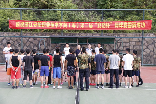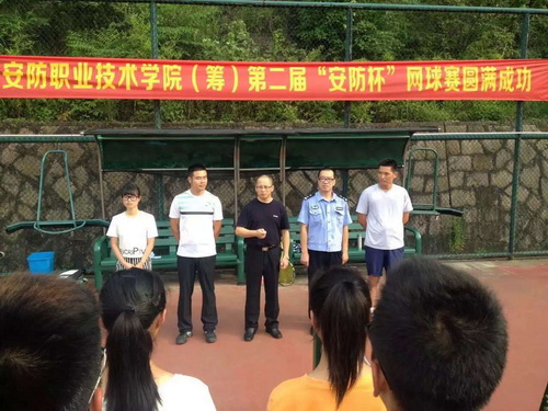 2015年6月17日下午,我校“安防杯 ”网球赛开幕式在学院网球场开幕。温州警校校长胡益逊、学生处老师项纪明、学院团委副书记张豫、总务处盛冰以及校社团联合会会长高青青出席了本次开幕式。